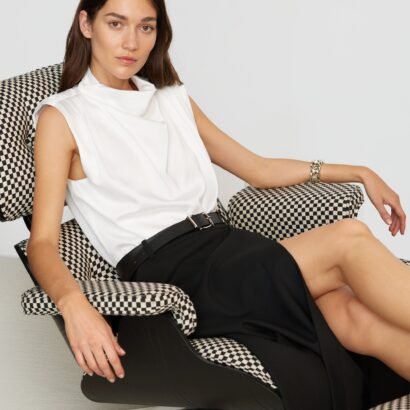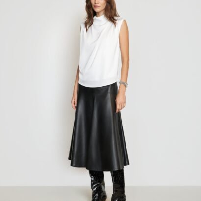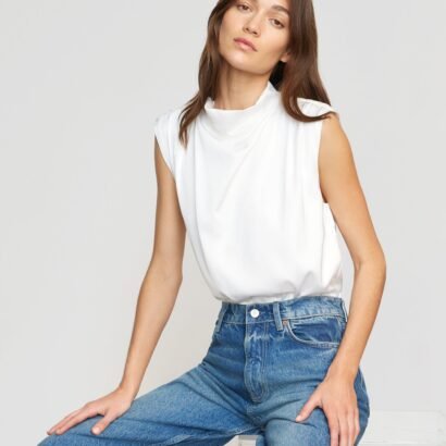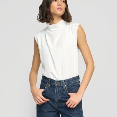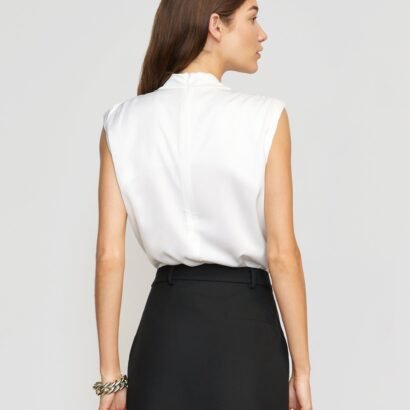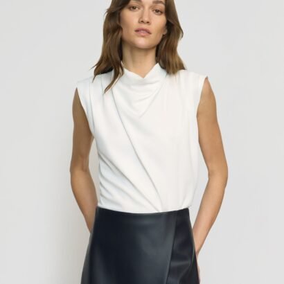 A refined, feminine sleeveless blouse with a beautiful gathered neckline — perfect for the office and the weekend styled with trousers or a midi skirt.