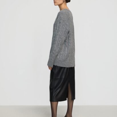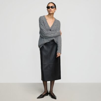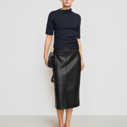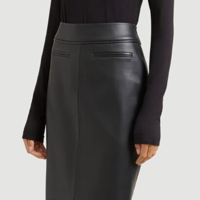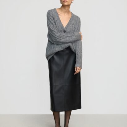 Our latest take on the vegan leather skirt — Briony features a sleek silhouette with a back split for easy movement. We love to style this midi with a cozy sweater for an effortless day-to-night look.