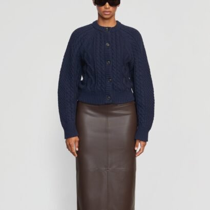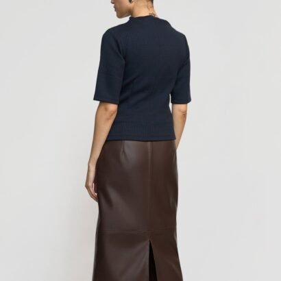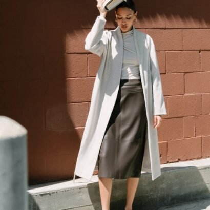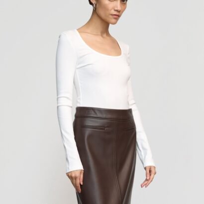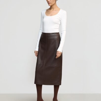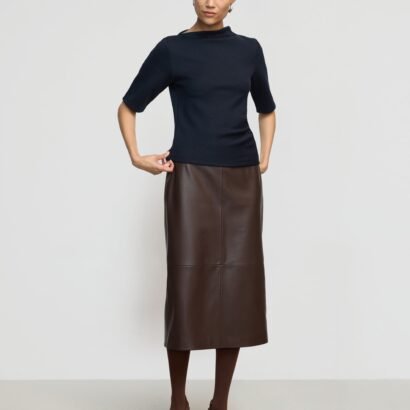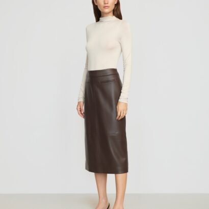 Our latest take on the vegan leather skirt — Briony features a sleek silhouette with a back split for easy movement. We love to style this midi with a cozy sweater for an effortless day-to-night look.