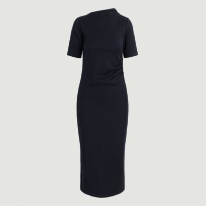 A sleek, knit dress with directional ribbed details — Evie is perfect for transitioning through the seasons. Featuring an asymmetrical neckline and ruching on the side for ease, you’ll find yourself reaching for this dress for any occasion.