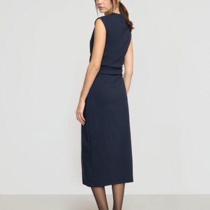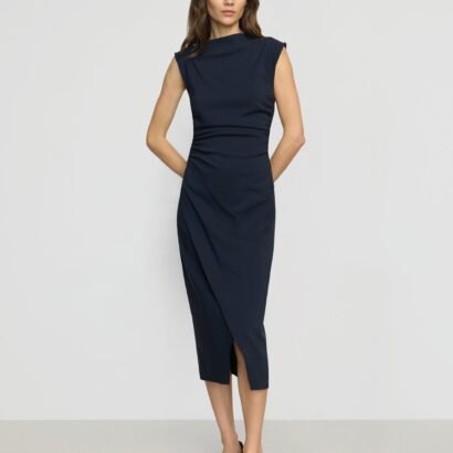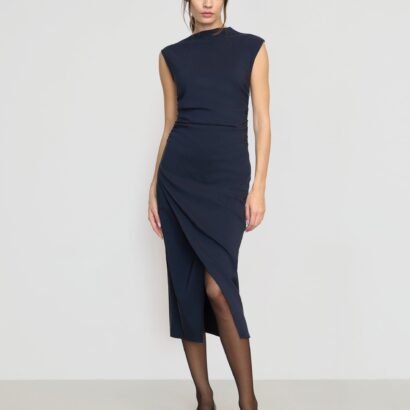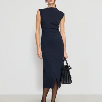 The elevated midi dress is a wardrobe must-have — Manon exudes effortless polish with its asymmetric neckline, ruched sides, and wrap front. We love to style it with a sleek pair of heeled boots for a desk-to-drinks look.