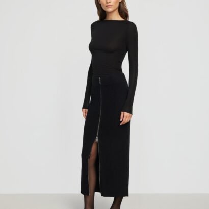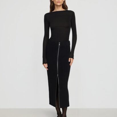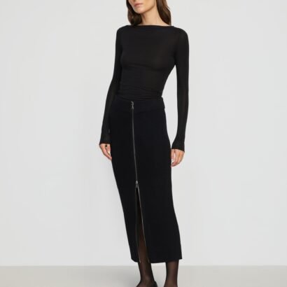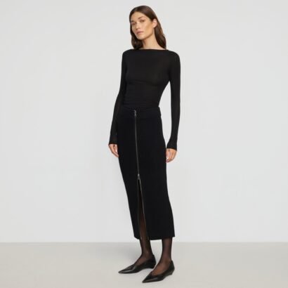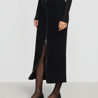 Versatile and fashion-forward, this cozy knit skirt features a functional two-way zip front and a flattering silhouette. Style with an easy tee or a polished blouse for a chic weekend or work look.